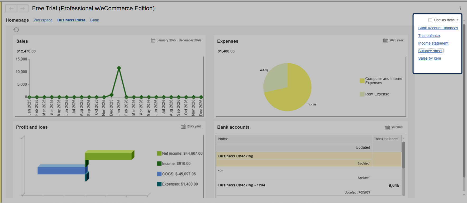 Located on the right-hand side of the Business Pulse dashboard, this menu provides one-click access to run and view essential financial reports.