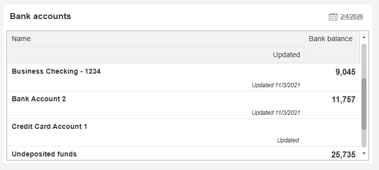 - A list of your connected bank accounts (e.g., Business Checking) and their current balances.