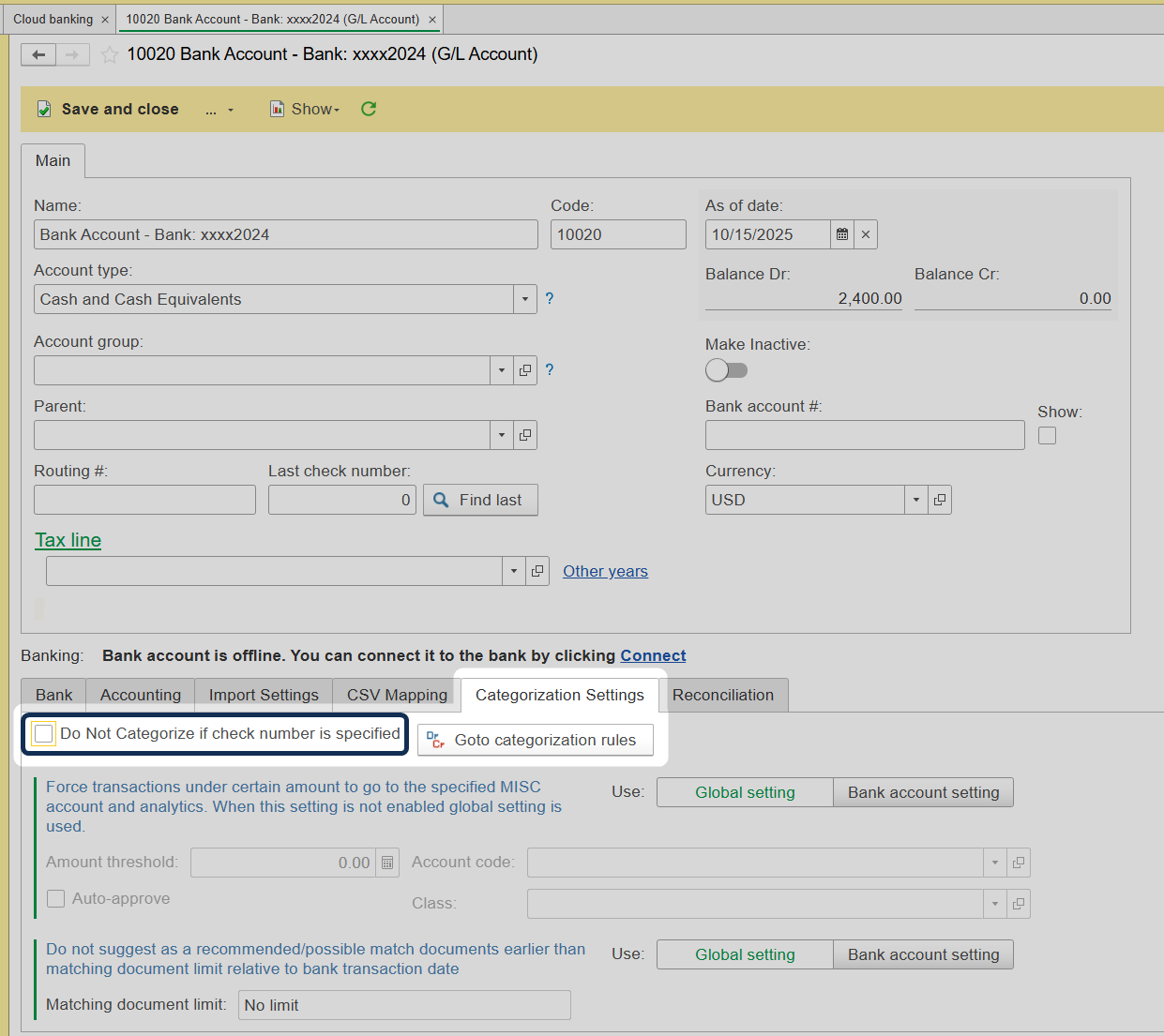Note: The check number prevents the rule from appearing by default. Disabling this setting will allow you to proceed with categorization.