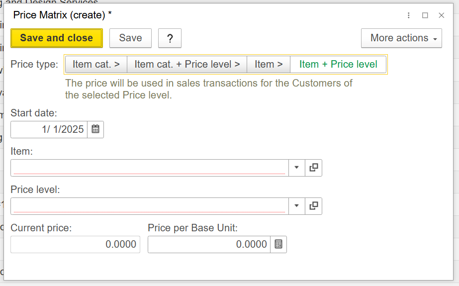 Remember: In the Price Type field, choosing Item results in a single price for an item. Choosing Item Category will price all items within the category. The Price Level choice uses a customer’s entered Price Level. Finally, Item Category + Price Level will use both factors when determining pricing on an order, invoice or sale.