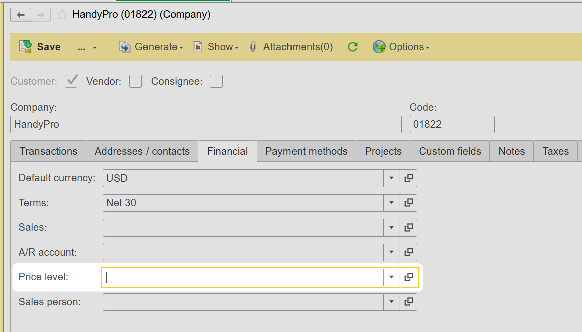 - Assign each of the applicable customers the Price Level. The Price Level is assigned on the Company card (Customer). Go to Lists > Companies or Customers> open the company card > click the Financials tab > assign the Price Level.